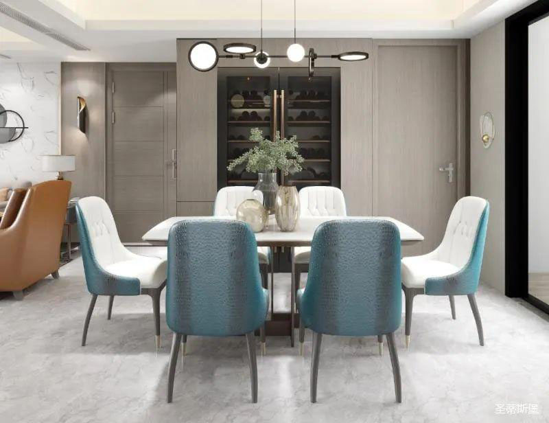 ▲澄亮湖藍的餐桌椅,一定是空間的點睛之處,溫柔跳脫的色彩,賦予了生活多姿多彩的體驗。經(jīng)典黑的簡約燈飾,在不忘溫馨氛圍的同時,也引領(lǐng)著造型界的時尚潮流。