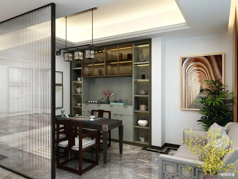 客廳與茶室之間以長(zhǎng)虹玻璃隔斷,有效的劃分功能區(qū),為空間展現(xiàn)一番“猶抱琵琶半遮面”的東方意境美。茶室將意式極簡(jiǎn)與傳統(tǒng)風(fēng)格糅合,摒棄繁雜、刻板的形式,以含蓄的現(xiàn)代極簡(jiǎn)詮釋著東方美學(xué),展現(xiàn)著傳統(tǒng)的待客之道。實(shí)木與鎢金金屬質(zhì)感碰撞,有棱有角,高級(jí)感頃刻得到了升華。