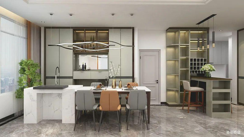 餐廚開(kāi)放式設(shè)計(jì),令空間更為清透明亮。色系一致的餐邊柜,封閉與開(kāi)放式儲(chǔ)******立又統(tǒng)一,正面鑲嵌玻璃,延伸了視覺(jué)空間,僅用簡(jiǎn)約線(xiàn)條區(qū)分,將意式極簡(jiǎn)形式展現(xiàn)。造型別致的金屬線(xiàn)條燈飾,給整體空間帶來(lái)了靈動(dòng)感。