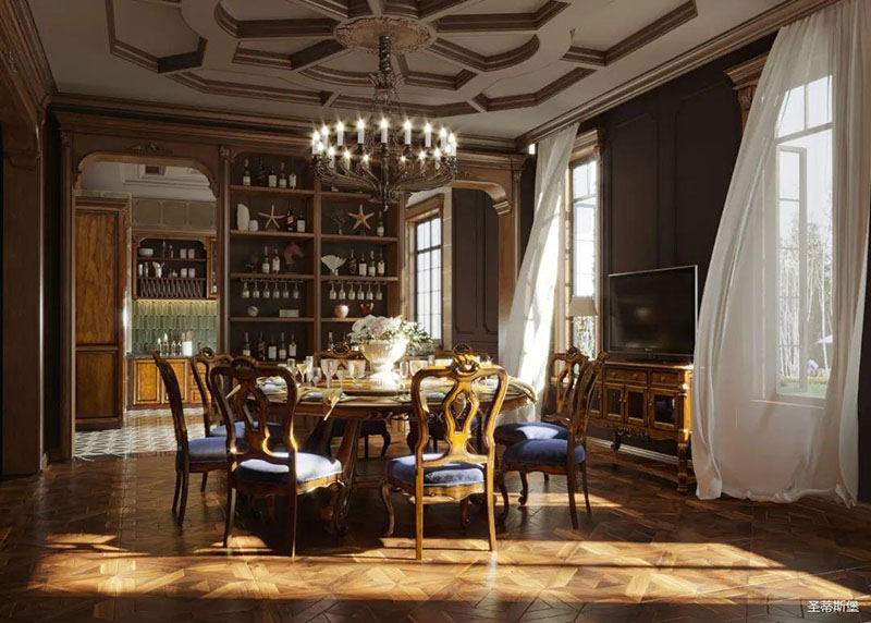 轉(zhuǎn)角來(lái)到餐廳,這里是美食和言語(yǔ)交匯的場(chǎng)所,也是家人們卸下盔甲傳遞關(guān)懷的舒展空間!可旋轉(zhuǎn)餐桌,不僅為用餐帶來(lái)便利,圓盤造型,也詮釋著美式生活的無(wú)拘無(wú)束。陽(yáng)光透過(guò)薄簾,光影散落,隨手從餐邊柜拿一瓶紅酒,碰杯,共享空間與味蕾的盛宴。