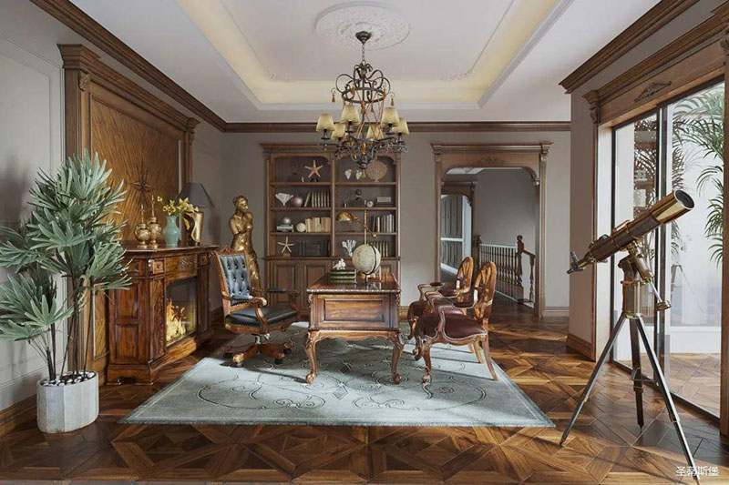 書(shū)房護(hù)墻板是由白楓木皮拼接的花鬘圖案,顏色層次分明,立體感超強(qiáng),營(yíng)造了滿滿的美式鑲嵌藝術(shù)感。深沉木色邊柜在護(hù)墻板上延伸,逐漸浸染了古銅色的家具和燈飾,結(jié)合著拱形羅馬柱,塑造出端雅大方的環(huán)境氛圍。