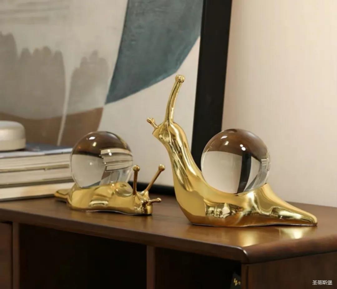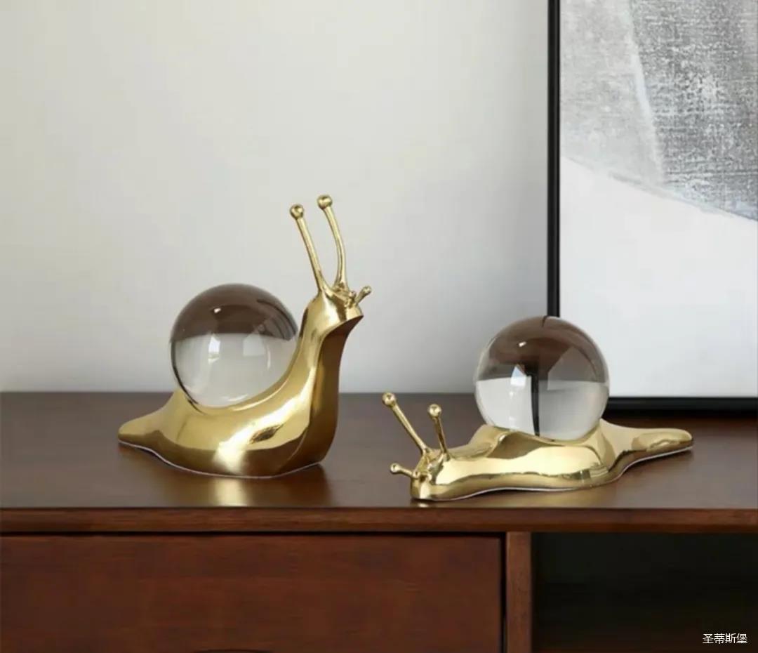 在黃銅材質(zhì)上勾勒出蝸牛流暢的肌肉線條,描摹蝸牛攀爬蠕動(dòng)與站立眺望的姿態(tài),加上觸須伸縮,豐富而逼真的細(xì)節(jié)制作,生動(dòng)有趣。