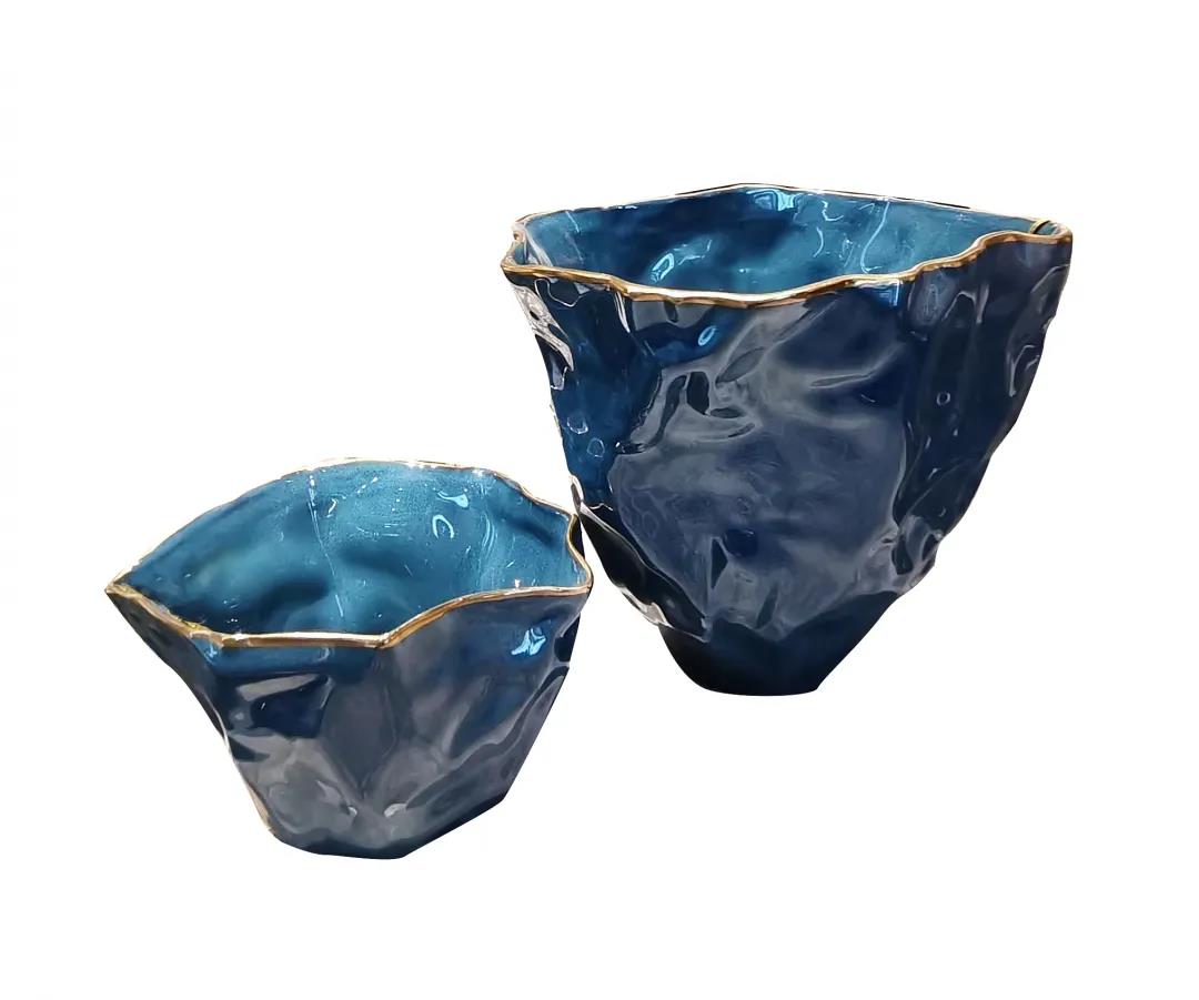 器口形狀各異,摒棄了傳統(tǒng)陶藝的方圓設(shè)計(jì),引領(lǐng)中西結(jié)合陶藝的時(shí)尚特性,金邊鑲嵌,運(yùn)用瓷器染色工藝,由深至淺洗染,以分明暗轉(zhuǎn)折。