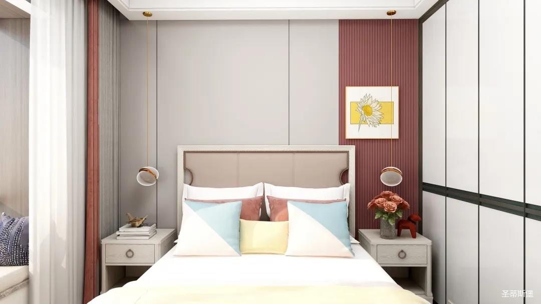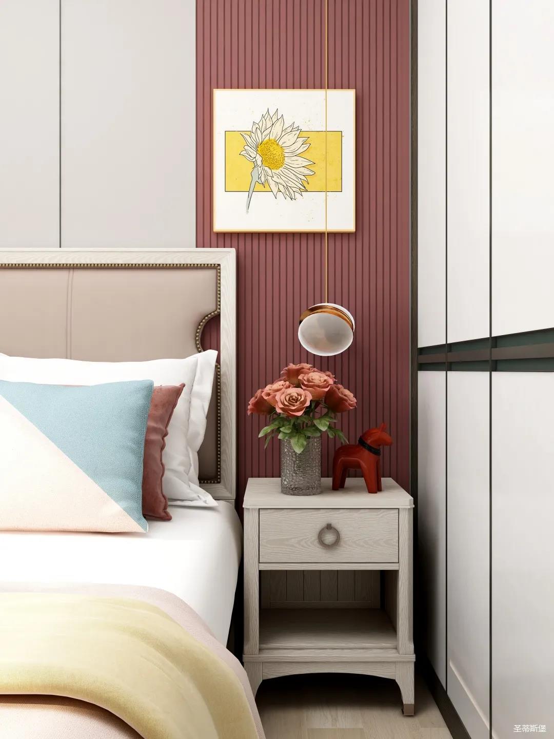 兒童空間雖不及其他空間寬敞,但細(xì)節(jié)設(shè)計更為貼心,淡粉的床屏與酒紅木飾面形成深淺色的對比,色彩跳躍,洋溢著兒童應(yīng)有的青春活力。床前的閱讀燈,讓空間設(shè)計感up的同時,也便利了兒童的閱讀學(xué)習(xí)。