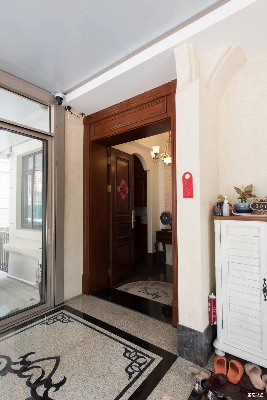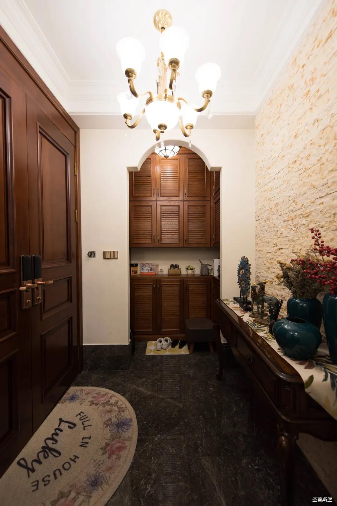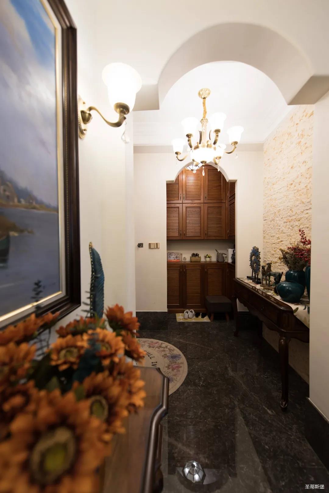 入戶玄關(guān)雙開門設(shè)計,儀式感滿滿!地面定制的瓷磚貼花設(shè)計,典雅又大方。核桃實木玄關(guān)桌,加上精致的擺件,經(jīng)典美式復(fù)古吊燈,不著痕跡的展現(xiàn)出居者對生活的激情,魅力吸睛,從入戶開始感受古典氛圍。