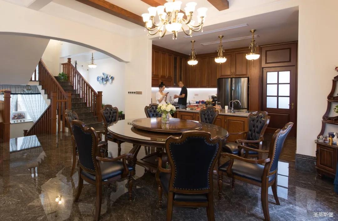 玄關(guān)進入轉(zhuǎn)角處,以穩(wěn)重大氣實木為主色調(diào)的開放式中西餐廚空間,將一體化無隔斷設(shè)計貫徹到每個細(xì)節(jié),采用了親膚真皮質(zhì)感的餐椅,手工雕刻的曲線讓原本硬朗的空間變得格外優(yōu)雅,自上而下,構(gòu)成完整的美式空間氣度,在每天的生活點滴間,沉浸在美式風(fēng)情中,更加隨性舒適。