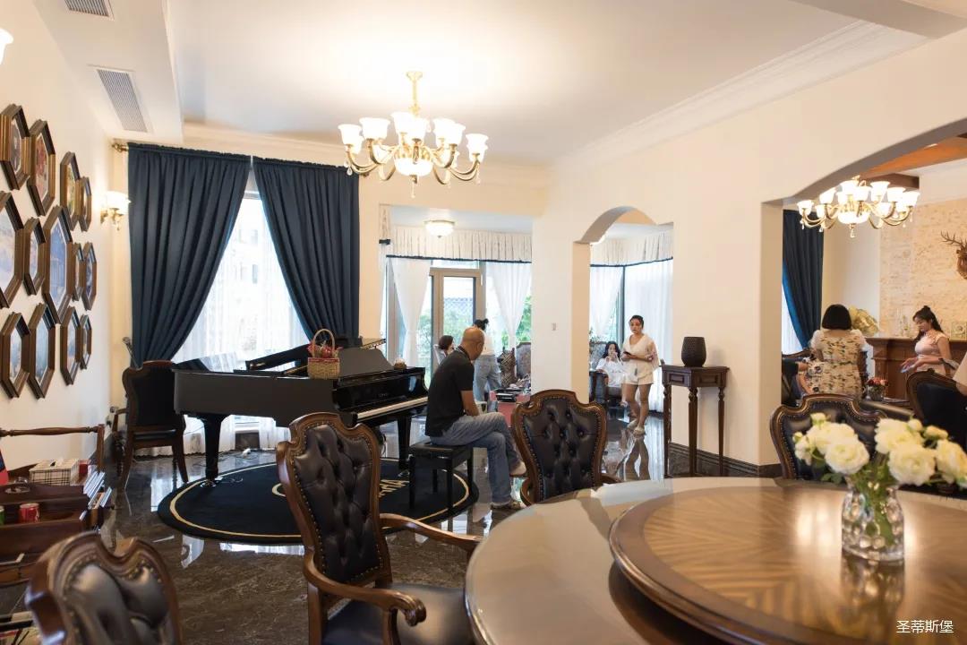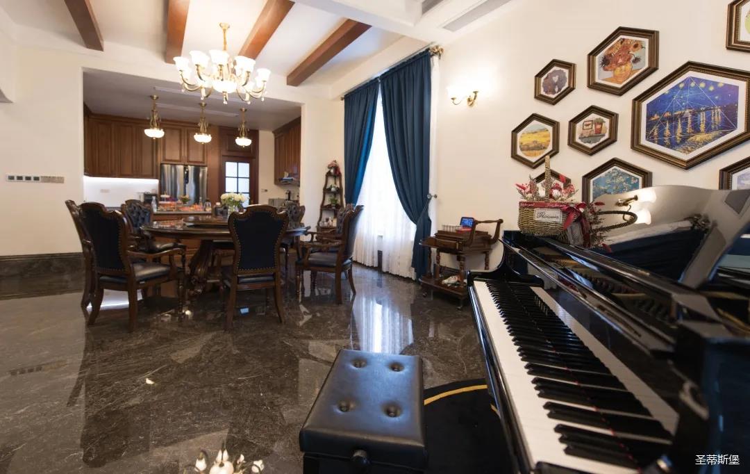 餐廳視線末端是一架鋼琴,與窗外景色相結(jié)合,擴大了視野,制造出移步易景的生活體驗。