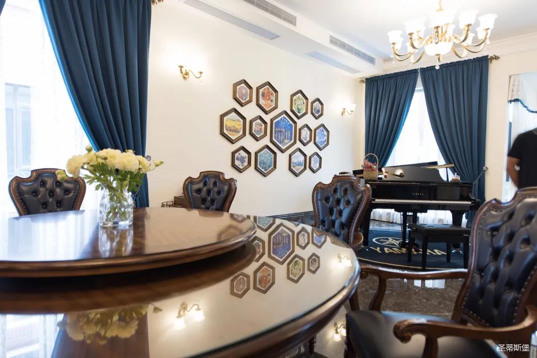 業(yè)主喜歡沉穩(wěn)的美式新古典風(fēng)格,整體統(tǒng)一的色調(diào),呈現(xiàn)了一種莊重的典雅感。醇厚的實木真皮沙發(fā),以古典的手法描繪出一種略帶復(fù)古的時尚奢華。一抹深藍(lán)迂回婉轉(zhuǎn)映照著空間的色系,明暗相對,符合著現(xiàn)代審美,卻又不顯沉悶。轉(zhuǎn)角處的一臺復(fù)古唱片機,還原了對音樂傾心的浪漫,抬起撥桿將唱針落下,隨著唱片的轉(zhuǎn)動和音樂的響起,美好的一天就此開始。