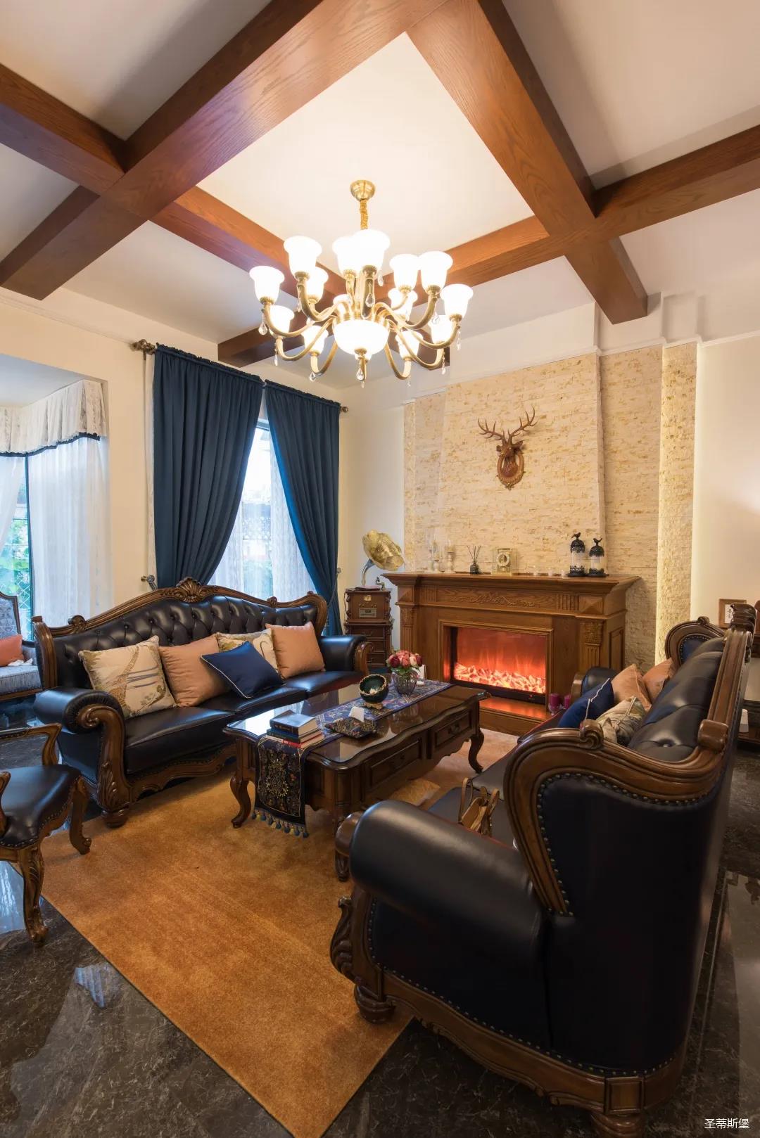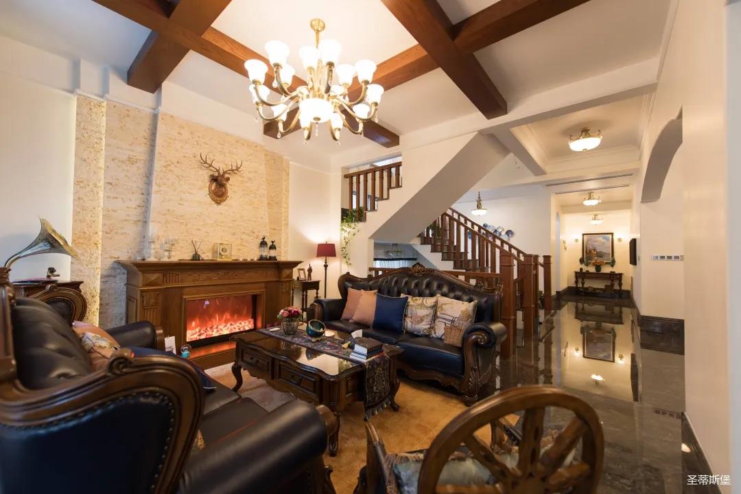 歐美實木吊頂設(shè)計,與沙發(fā)茶幾上下呼應(yīng),相得益彰,提升了空間層次感。