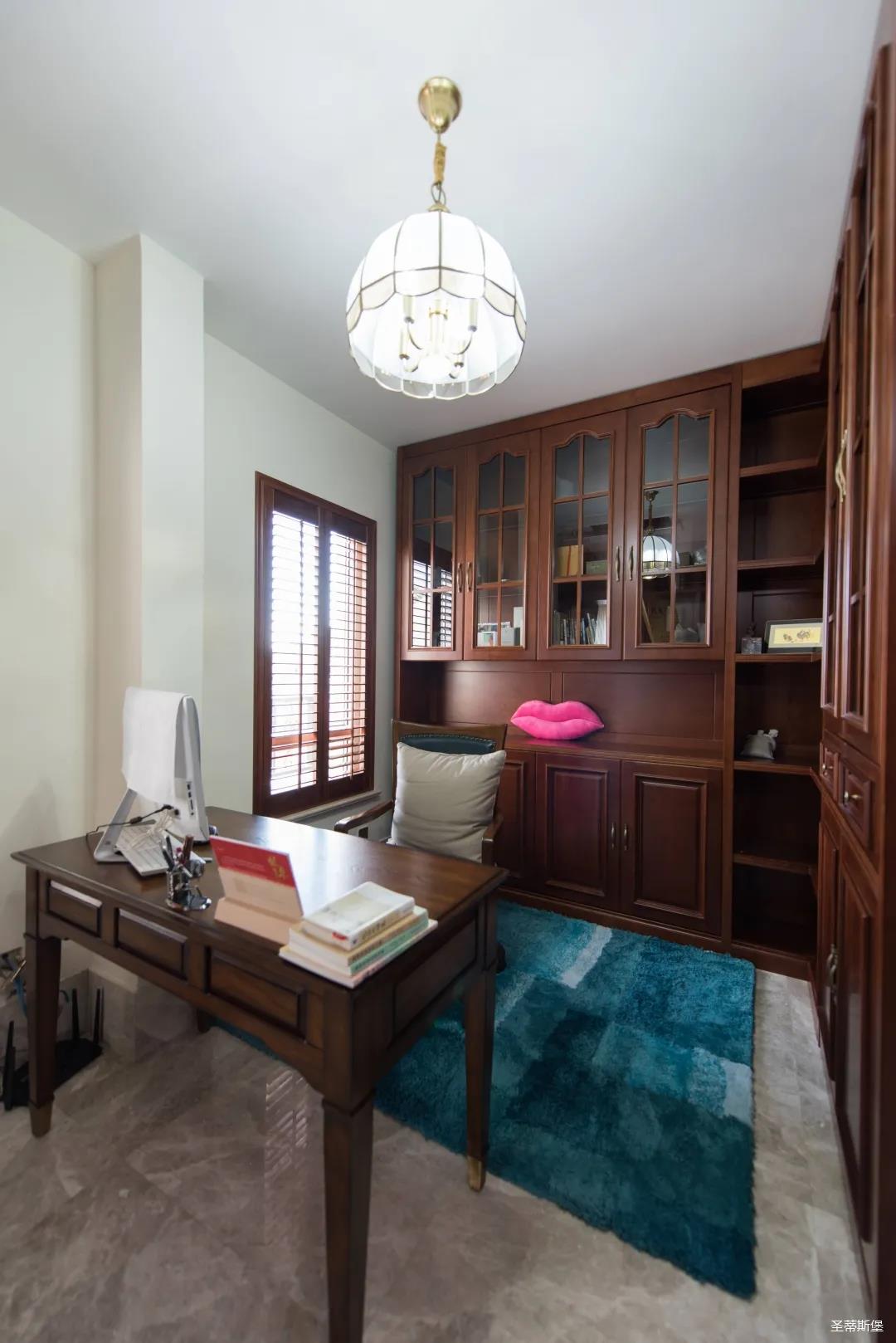 書房設(shè)立在二樓樓梯間,實木整體書柜為書房帶來自然的清香,開放式的空間布局把一家人鏈接在一起,增加彼此之間的互動交流與陪伴,同時也與樓下區(qū)域動靜分離,用一張書桌,一把舒適的皮質(zhì)沙發(fā)椅,與主人開啟一段安靜的閱讀時光。