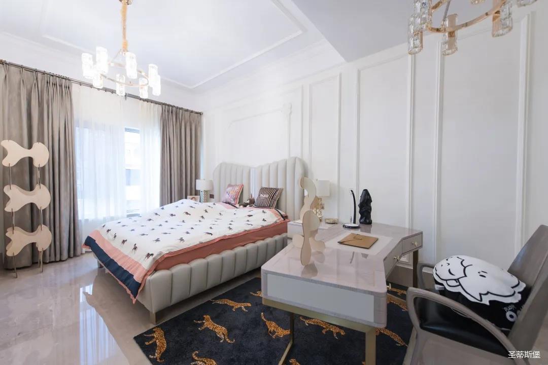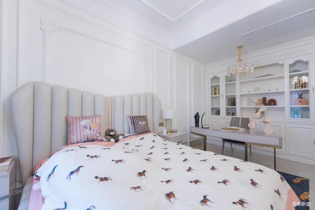 經(jīng)過房間玄關(guān)過道,一眼就被這夢幻的景象給征服,摒棄繁雜,少許的金色元素點綴,予以空間輕奢細(xì)膩的質(zhì)感,卻又不失美式韻味。
