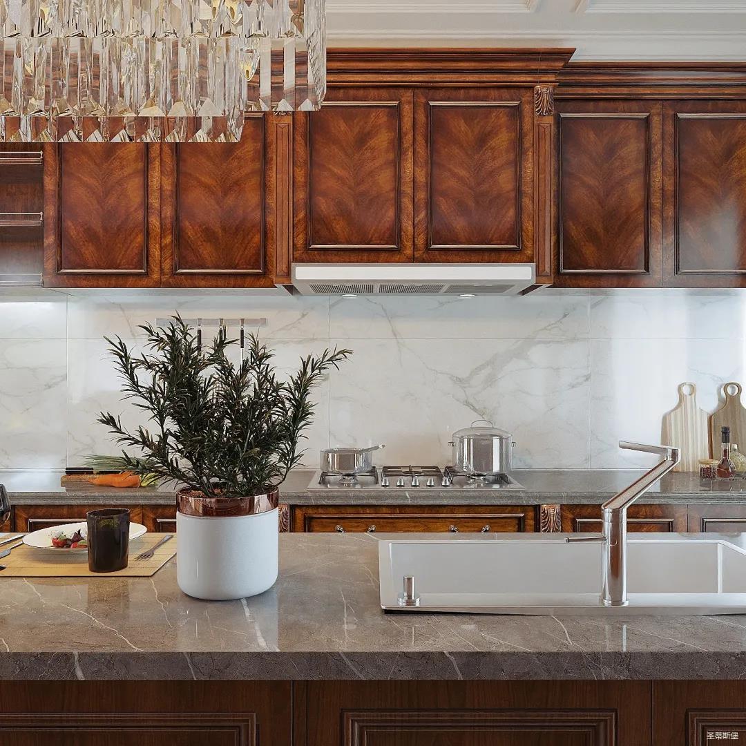 西廚設(shè)計(jì)更為統(tǒng)一,女業(yè)主喜好柔美優(yōu)雅的視覺(jué)效果,因此設(shè)計(jì)師特意將吊頂轉(zhuǎn)角做了圓弧處理,使冷峻的空間略帶圓潤(rùn),形成精致協(xié)調(diào)的空間格局。簡(jiǎn)潔的石膏吊頂與吧臺(tái)一致延伸,讓廚房視覺(jué)空間得以擴(kuò)大。金屬元素水晶吊燈,增加了空間的精致感,美式定制柜體將古典元素與現(xiàn)代電器相糅合,交錯(cuò)產(chǎn)生一種自然的違和感。