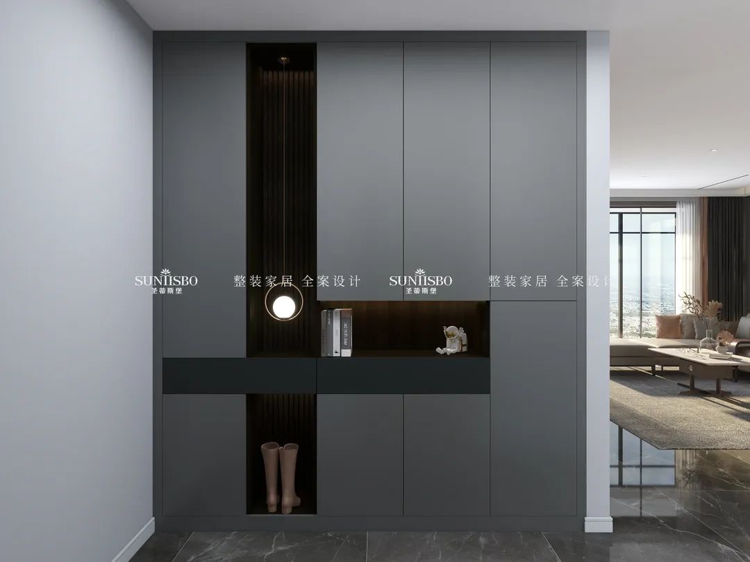 入口玄關(guān)處講究極致簡(jiǎn)潔,摒棄繁雜的設(shè)計(jì)元素,地面磚體采用與柜體相近的色調(diào),在界面轉(zhuǎn)折的地方著重連貫統(tǒng)一,讓入戶空間呈現(xiàn)科技立體感,趣味十足的藝術(shù)品擺放,使整體顯得高級(jí)又有顏值。在其中通過點(diǎn)狀燈光設(shè)計(jì),帶來躍動(dòng)而富有生命力的視覺焦點(diǎn),展現(xiàn)出現(xiàn)代時(shí)尚感。
