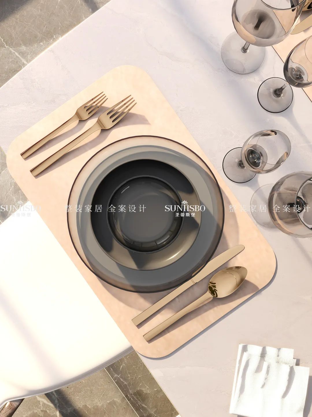 餐廳的設(shè)計(jì)采用整墻定制的餐邊柜,高級(jí)灰讓空間調(diào)性瞬間得到提升,半透明的玻璃展示區(qū),營造了多樣的空間和充滿極簡(jiǎn)藝術(shù)氣息的生活體驗(yàn)。