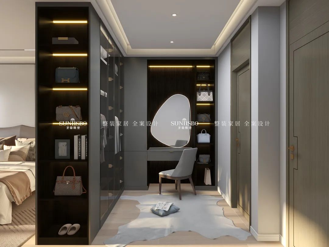 擁有一個(gè)專屬衣帽間是很多女生的夢(mèng)想。設(shè)計(jì)師回歸生活本質(zhì),究其外,是空間;究其內(nèi),是材質(zhì)、燈光,內(nèi)外融合,比例和諧。通過不規(guī)則狀的玻璃鏡面設(shè)計(jì),在時(shí)尚高級(jí)的定制空間中,傾訴著創(chuàng)意的真實(shí)和溫度,不僅擴(kuò)大了衣帽間視覺范圍,同時(shí)也給予了空間個(gè)性鮮明的藝術(shù)格調(diào)。