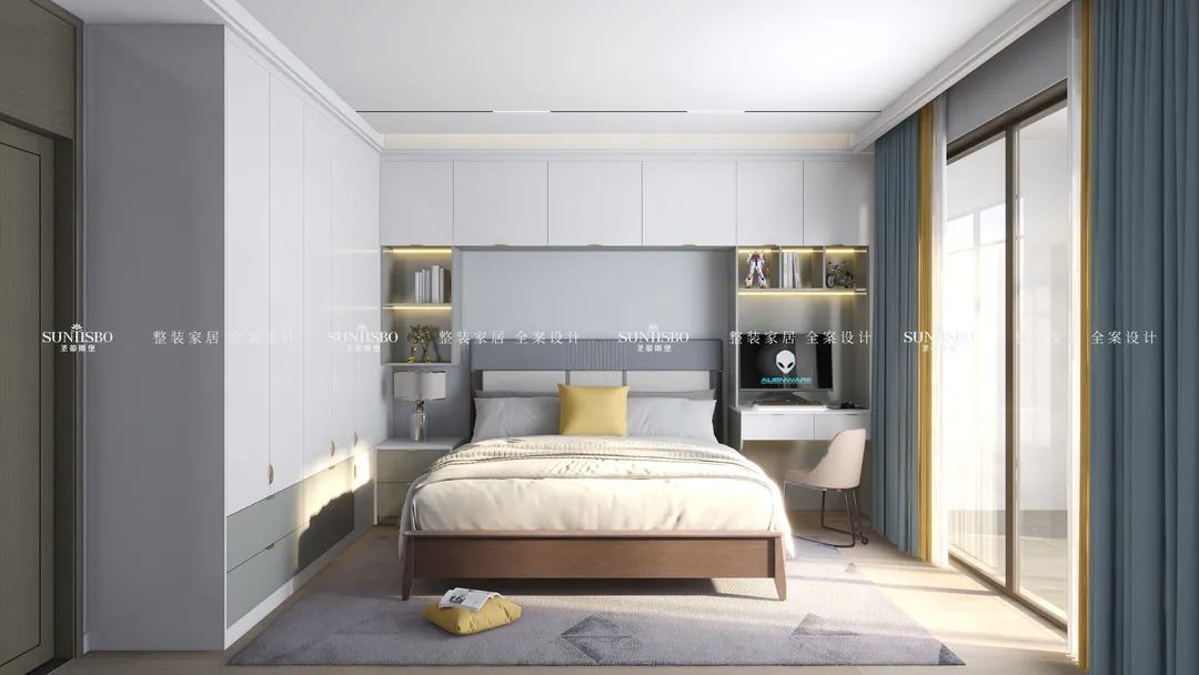 原色的木地板、淺灰的衣柜,搭配簡(jiǎn)約的背景墻,整個(gè)空間都呈現(xiàn)著祥和靜謐的氛圍。游走的光影,絕佳的開闊視野,使得空間充滿無限張力。黃綠拼接的窗簾,配合柔和的層板燈,營造舒適溫馨的起居氛圍。